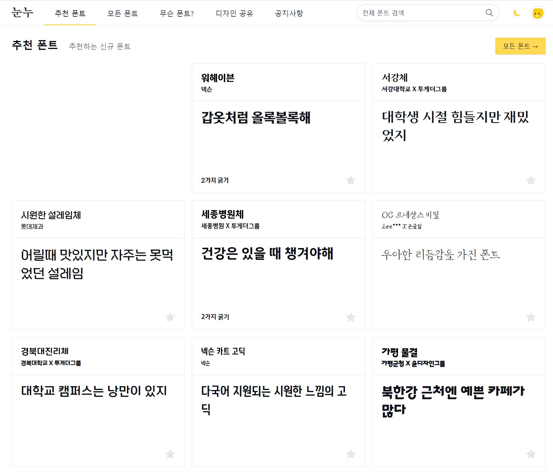 눈누에 있는 모든 폰트는 '상업적 사용이 가능'한 폰트라 타 폰트에 비해 비교적 쉽게 사용할 수 있습니다.