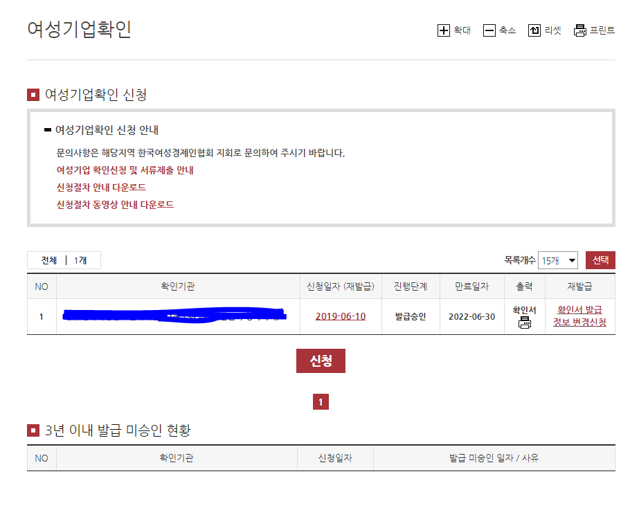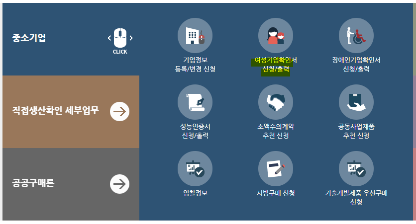 여성기업 확인서를 신청 및 출력하실 수 있게됩니다.