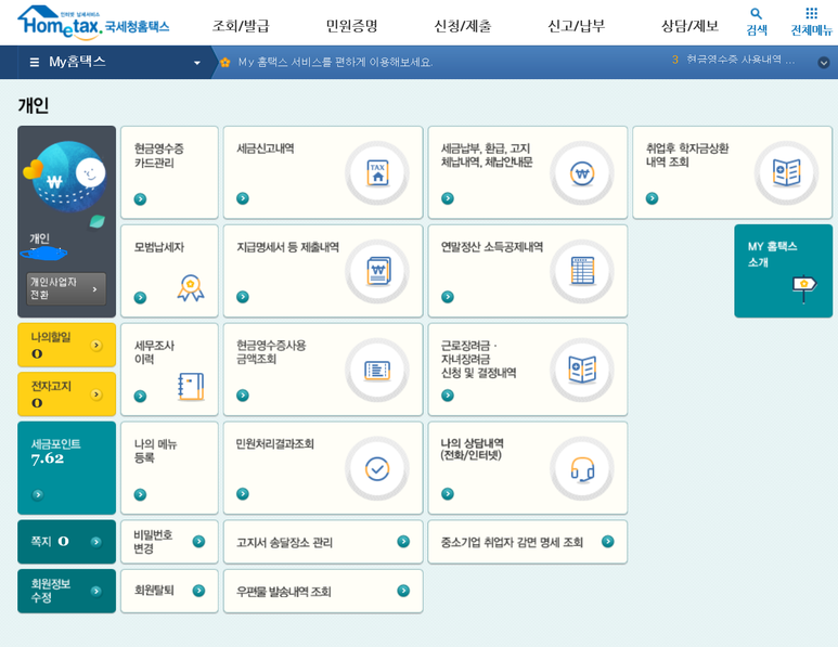 요 박스를 클릭하면 개인적인 홈텍스 정보 및 관리를 하는 화면으로 바뀌게 됩니다.
