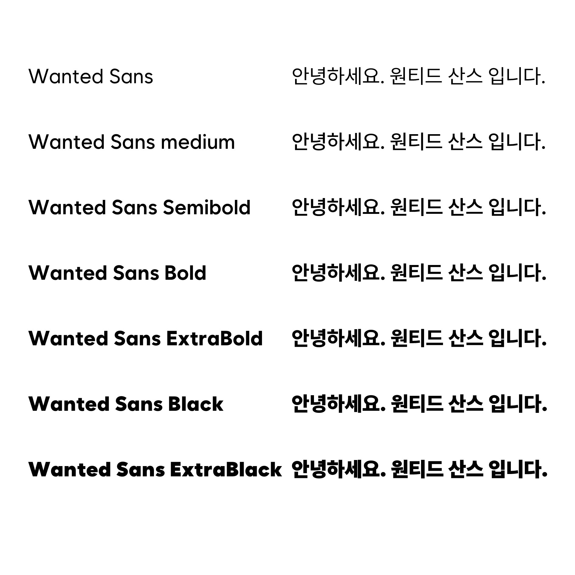 원티드산스 폰트는 총 7개의 굵기로 이루어져 사용성이 높습니다.