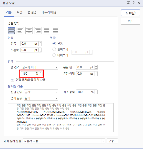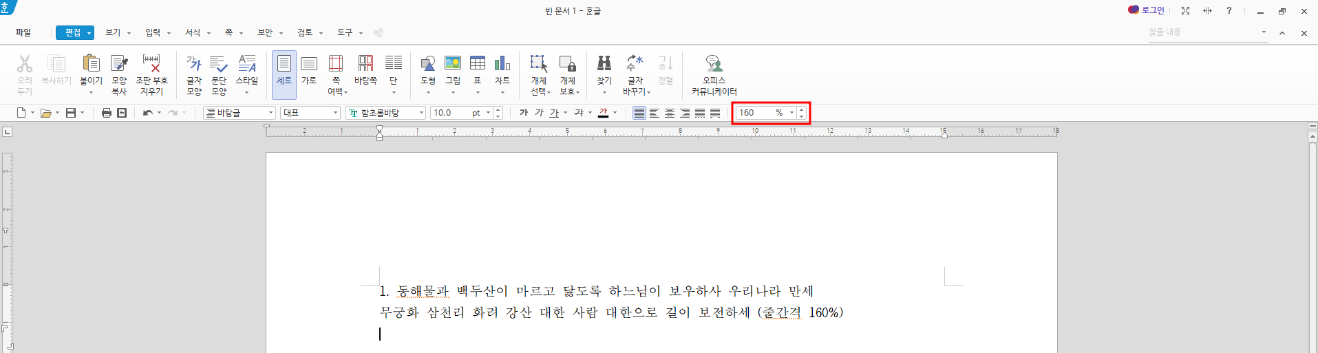 보통 한글 문서를 열 때 기본적으로 160%로 세팅되어 있습니다.