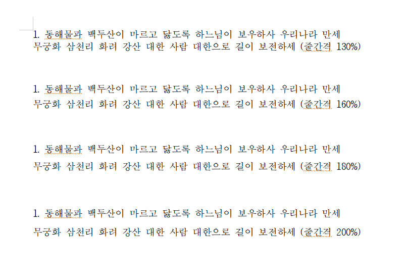위에서부터 줄간격 130%, 160%(기본), 180%, 200% 입니다.
