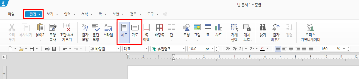 상단 메뉴탭에서 [편집]을 누르면 아래와 같이 세로/가로를 선택할 수 있는 버튼이 활성화됩니다.