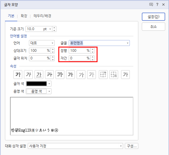 글자 모양 새 창에서 보면 장평과 자간을 조절하는 부분이 있음이 확인됩니다.