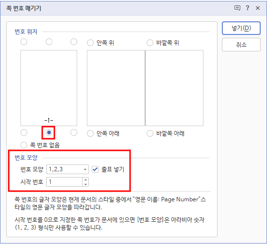 2. 쪽번호 위치 및 번호 모양 설정
