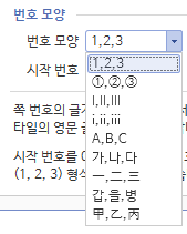 또한 해당 번호 모양도 설정할 수 있습니다. 기본은 1, 2, 3이고 줄표 넣은 상태로 설정이 되어 있어요.