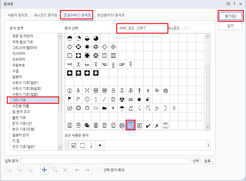 2. 문자표에서 체크박스를 찾아 넣기