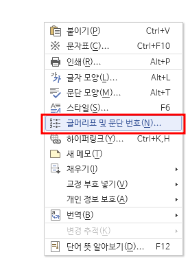 아래와 같은 창이 나오면 '글머리표 및 문단 번호'를 눌러줍니다.