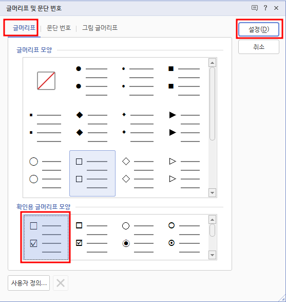 해당 확인용 글머리표 모양을 선택한후 [설정]을 눌러봅시다.